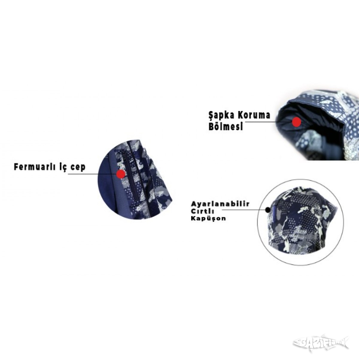 *Kapüşonda bulunan şapka bölmesi ile şapka kullandığınız zamanlarda suyun yüzünüze akması engellenmiş olur. Kapüşonu ayarlayabilmeniz için arkasında cırtlı bir ayar apartı vardır, ayrıca yüzünüze göre ayarlamınız için de ayar lastikleri mevcuttur.