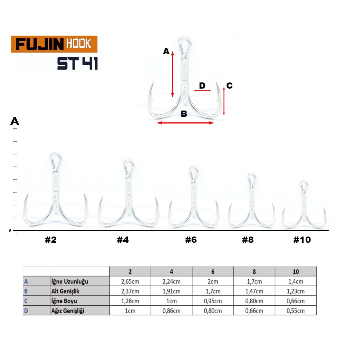 Yeni Fujin ST41 Üçlü Maket Balık İğnesi, Maket balıklarınız için özel olarak tasarlanmış fiyat performans ürünlerinden. Maket balıklarınızn boyuna göre farklı numaralarını seçerek kullanabilirsiniz. Nickel kaplamalıdır, ekstra keskindir. Jigleriniz ve Büyük Maketleriniz için kullanıma uygundur.
